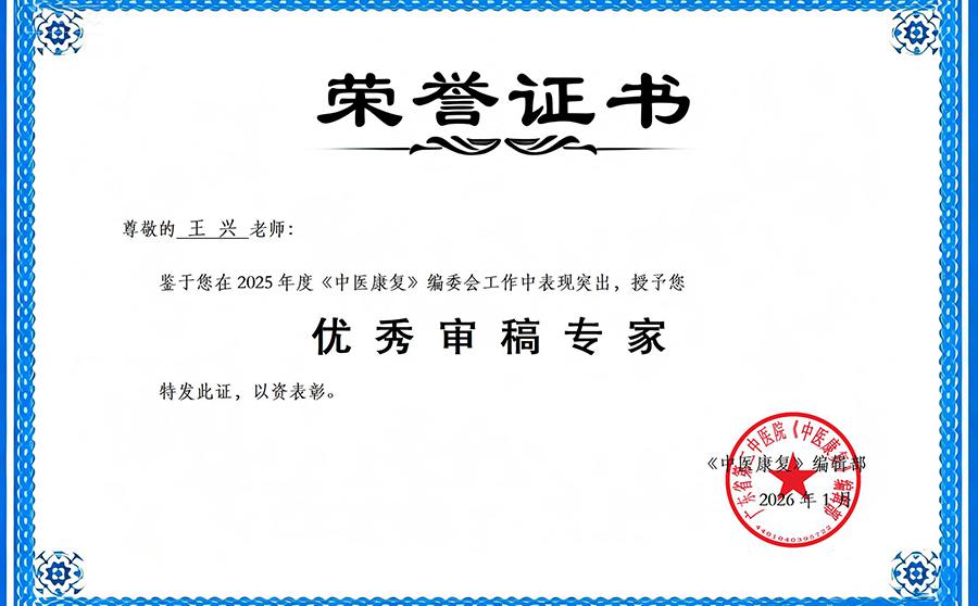 近日,《中医康复》杂志公布了2025年度优秀编委、青年编委、审稿专家及优秀论文名单。西安中医脑病医院科教部王兴以严谨的学术态度、专业的审稿水平以及对期刊建设的重要贡献,被授予“优秀审稿专家”称号。