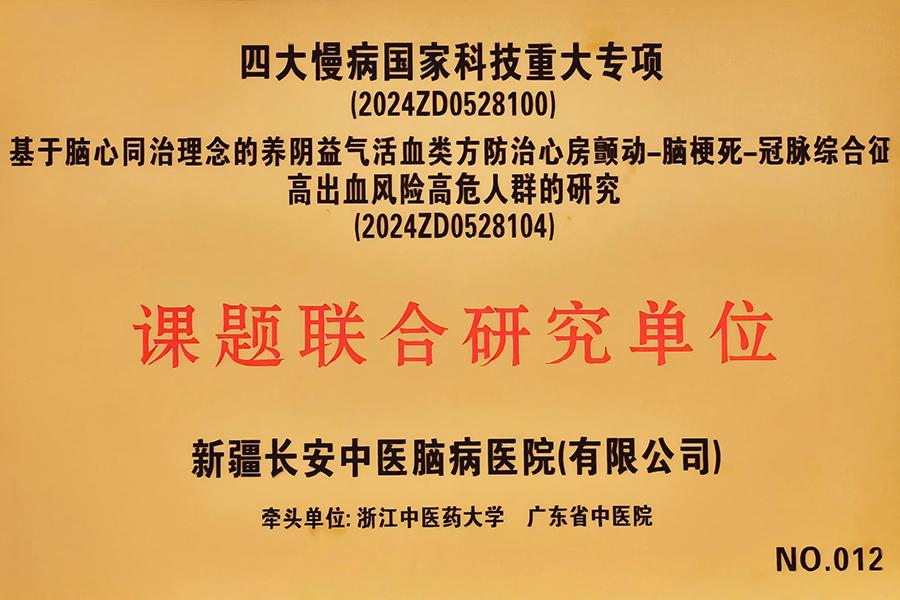 3月4日,四大慢病国家科技重大专项——《基于脑心同治理论理念的养阴益气活血类方防治心房颤动-脑梗死-冠脉综合征高出血风险高危人群的研究(2024ZD0528104)》课题联合研究单位在新疆长安中医脑病医院挂牌。本课题系国家科技重大专项“四大慢病”2024年度立项项目之一,由浙江中医药大学、广东省中医院等多家单位共同承担,将建立全国多中心前瞻性登记研究数据库,构建具有中医特色的出血风险预测模型,评估不同治疗模式下的心脑血管事件与出血发生率,旨在形成针对高出血风险人群的中医药干预方案。
